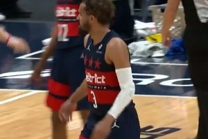 GIF-特雷·杨挤掩护时撞倒理查德,腿部有些受伤,一瘸一拐回更衣室