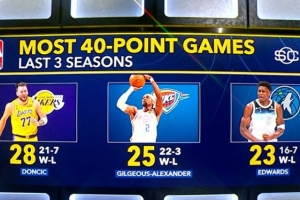 近3季40+排名:东契奇28场(21胜7负)、亚历山大25场(22胜3负)、华子23场(16胜7负)