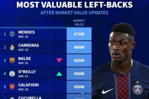 最新足坛左后卫身价排行榜:门德斯7500万欧元第一,卡雷拉斯第二