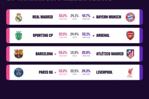 体育资讯4月7日讯 欧冠1/4决赛首回合即将开战,Opta超级计算机预测了首回合各队的取胜概率。