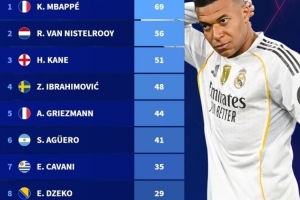 体育资讯4月9日讯 《转会市场》统计了从未夺得欧冠冠军的欧冠射手榜,姆巴佩领跑。