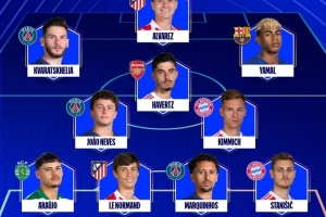 中场:若昂·内维斯(巴黎)、哈弗茨(阿森纳)、基米希(拜仁)