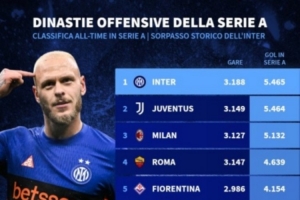 意甲历史进球榜:国米超越尤文登顶,米兰、罗马、佛罗伦萨前五